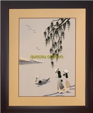 Tranh thêu tay phong cảnh thiếu nữ áo dài