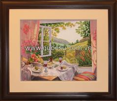 Tranh thêu tay phong cảnh bên khung cửa sổ