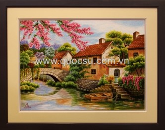 Tranh thêu tay phong cảnh nhà bên cầu